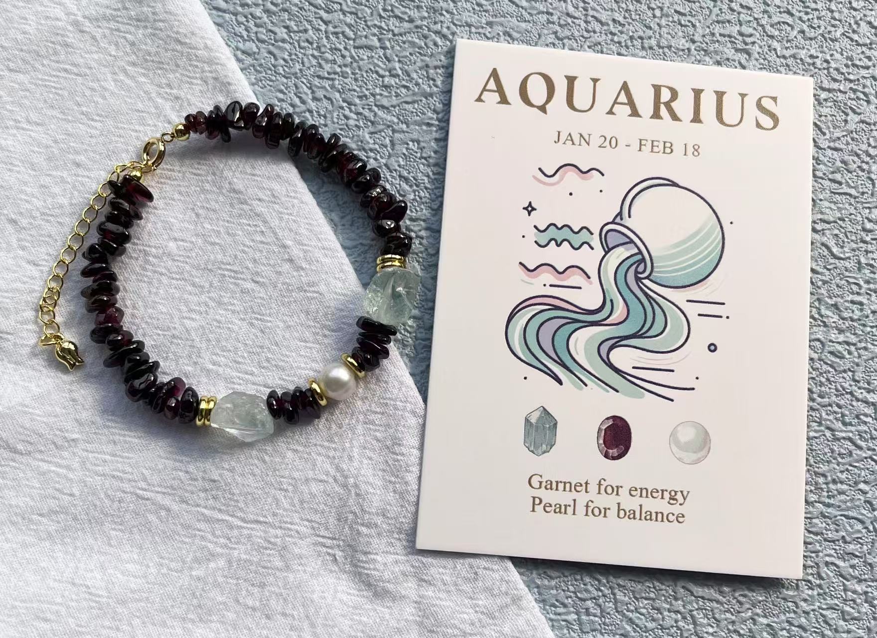 水瓶座(ガーネット、真珠):ガーネットは水瓶座の活力と意欲を高め、社交性を向上させ、真珠は親近感と友好感を与えます。