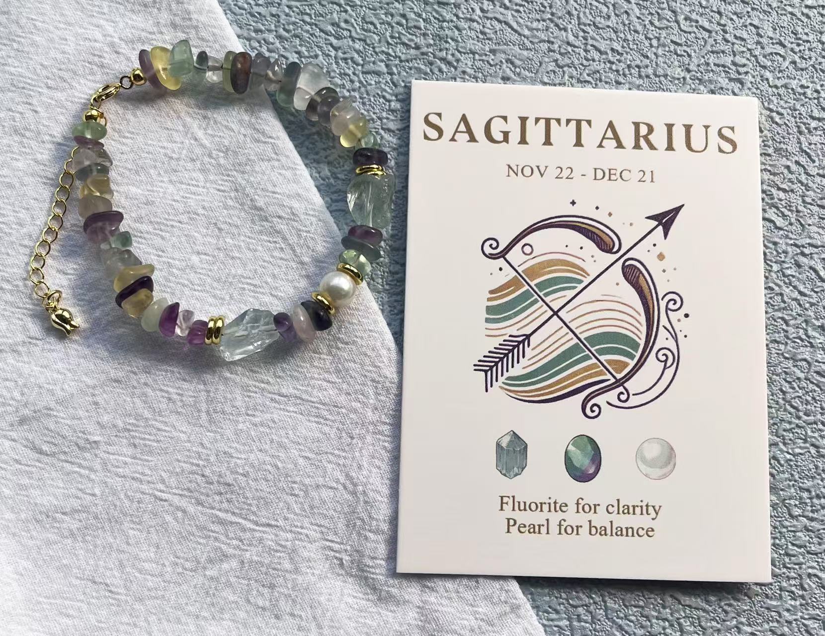 射手座(蛍石、真珠):蛍石は射手座の思考を明晰にし、知恵と精神的なエネルギーを高め、真珠と組み合わせると精神的な自由を高めます。